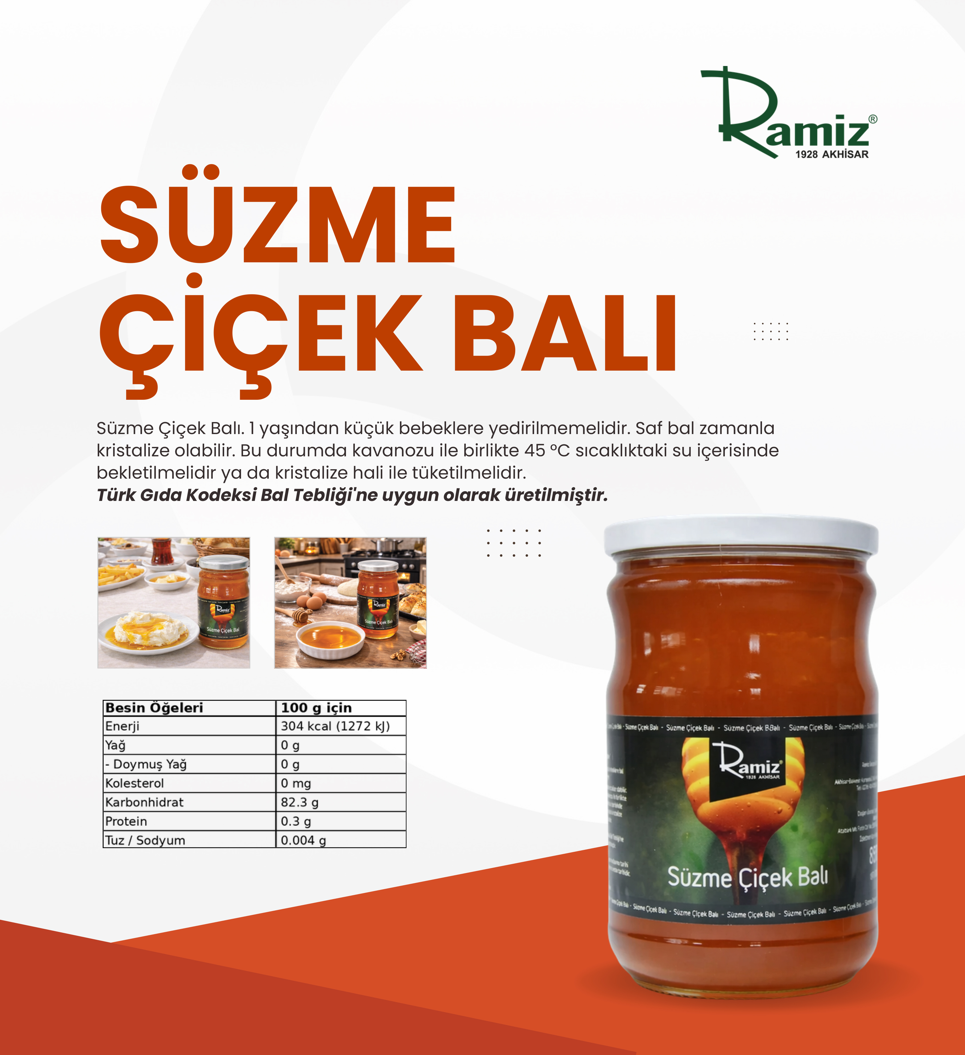 %100 Saf Süzme Çiçek Balı 850 gr. İçindekiler ; Süzme Çiçek Balı. 1 yaşından küçük bebeklere yedirilmemelidir. Saf bal zamanla kristalize olabilir.Bu durumda kavanozu ile birlikte 45 °C sıcaklıktaki su içerisinde bekletilmelidir ya da kristalize hali ile tüketilmelidir. Türk Gıda Kodeksi Bal Tebliği'ne uygun olarak üretilmiştir. Ramiz ürünleri 1928'den beri lezzet markasıdır. Üretim tesislerimiz T.C TARIM VE ORMAN BAKANLIĞI onaylıdır.
