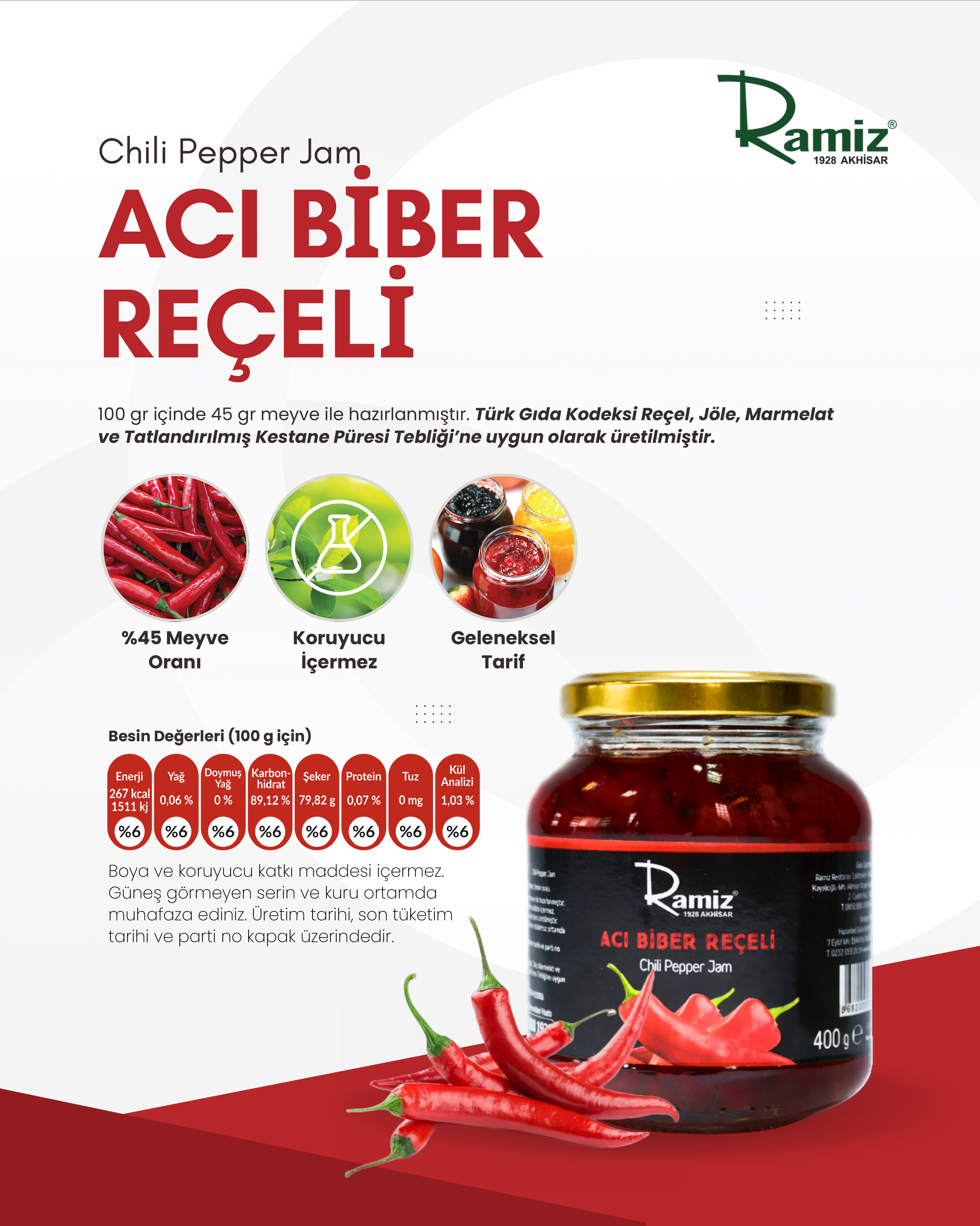 Doğal Katkısız Acı Biber Reçeli 380 gr.  İçindekiler:Acı biber,şeker,limon suyu. Türk Gıda Kodeks Reçel,Jöle,Marmelat ve Tatlandırılmış Kestane Püresi Tebliği'ne uygun olarak üretilmiştir.Ramiz ürünleri 1928'den beri lezzet markasıdır.  Üretim tesislerimiz TC.TARIM VE ORMAN BAKANLIĞI onaylıdır.