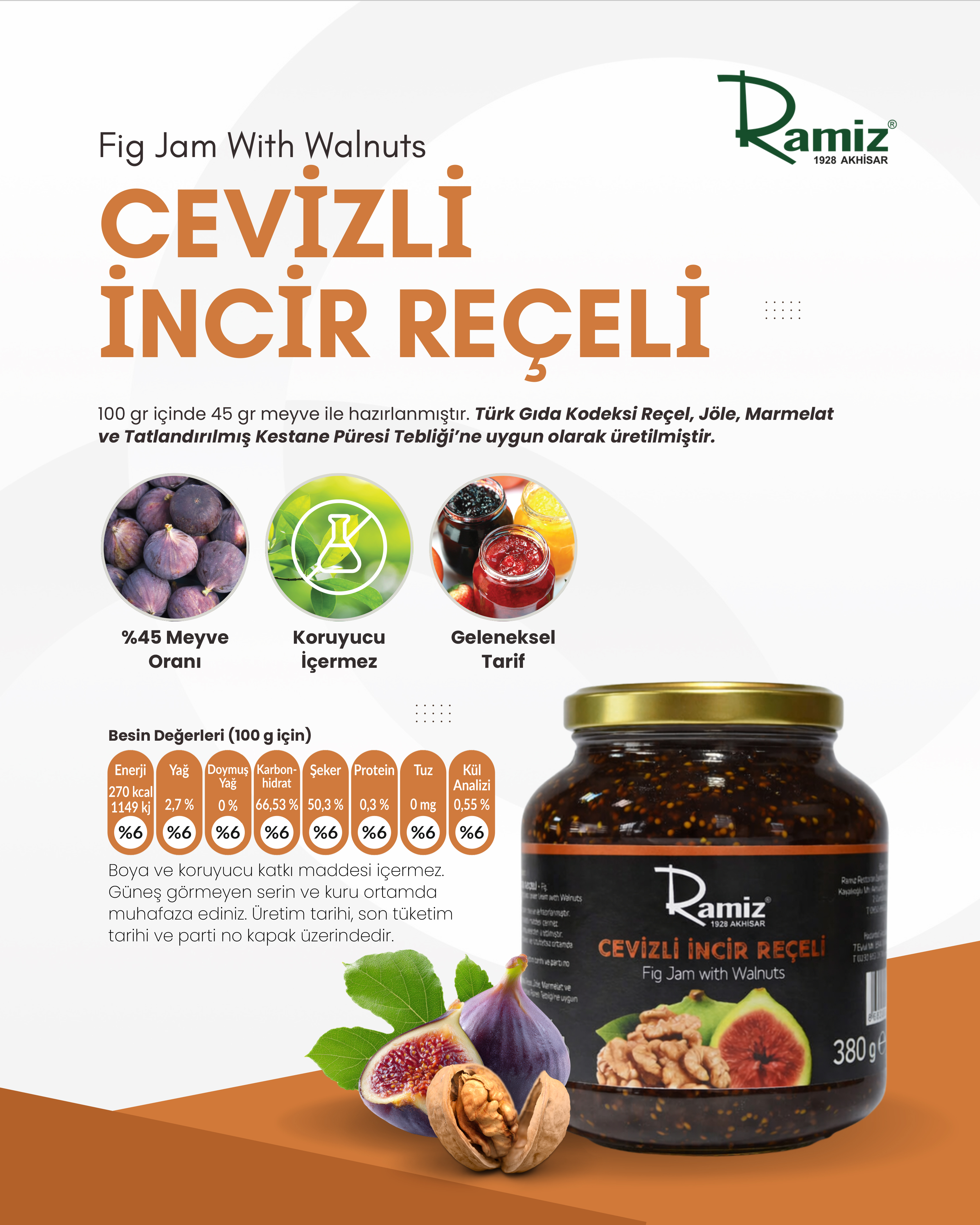 Doğal Katkısız Cevizli İncir Reçeli 380 gr.  İçindekiler:İncir,ceviz,şeker,limon suyu. Türk Gıda Kodeks Reçel,Jöle,Marmelat ve Tatlandırılmış Kestane Püresi Tebliği'ne uygun olarak üretilmiştir.  Ramiz ürünleri 1928'den beri lezzet markasıdır. Üretim tesislerimiz TC.TARIM VE ORMAN BAKANLIĞI onaylıdır.