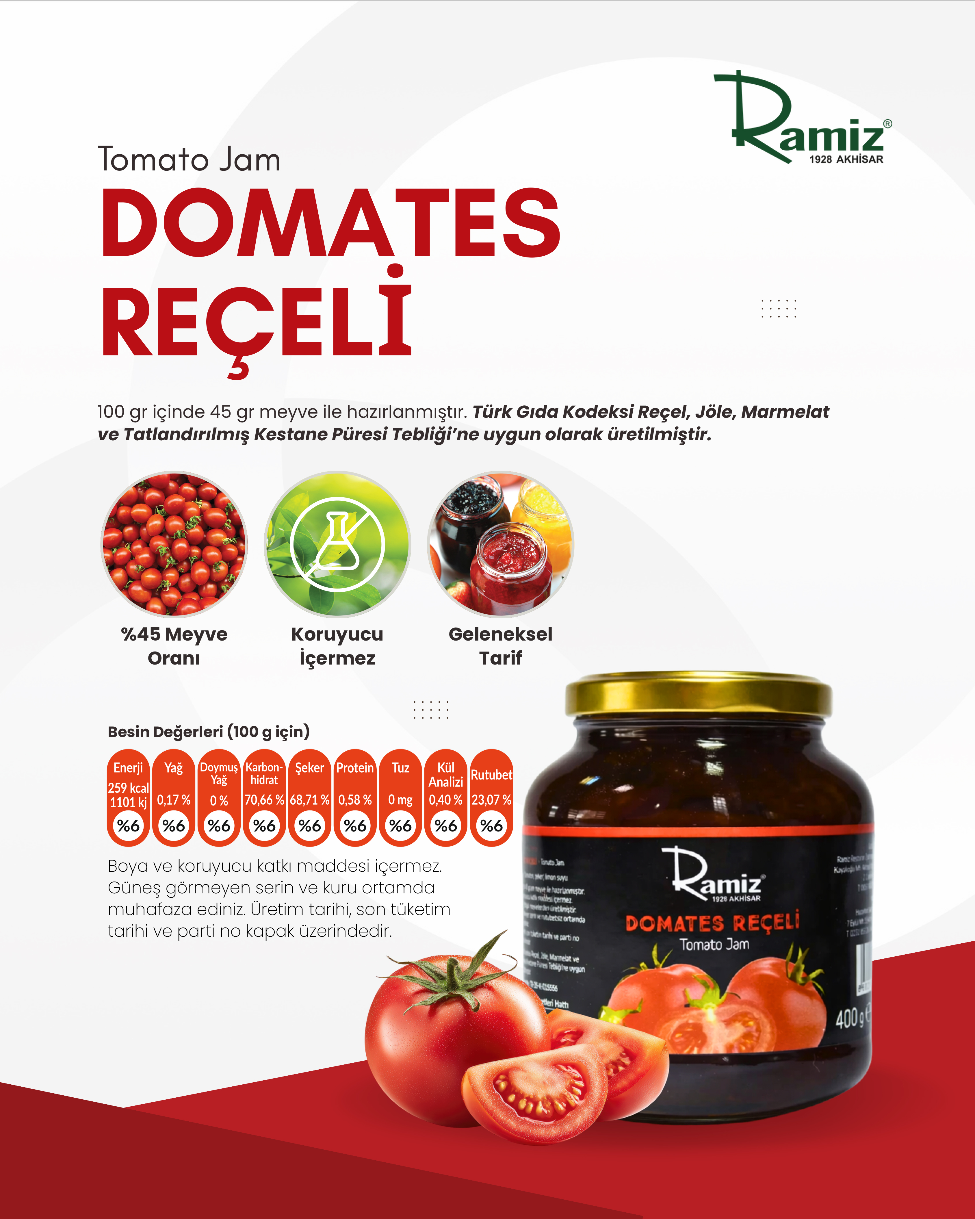 Doğal Katkısız Domates Reçeli 380 gr. İçindekiler:Domates,şeker,limon suyu. Türk Gıda Kodeks Reçel,Jöle,Marmelat ve Tatlandırılmış Kestane Püresi Tebliği'ne uygun olarak üretilmiştir.  Ramiz ürünleri 1928'den beri lezzet markasıdır. Üretim tesislerimiz TC.TARIM VE ORMAN BAKANLIĞI onaylıdır.;