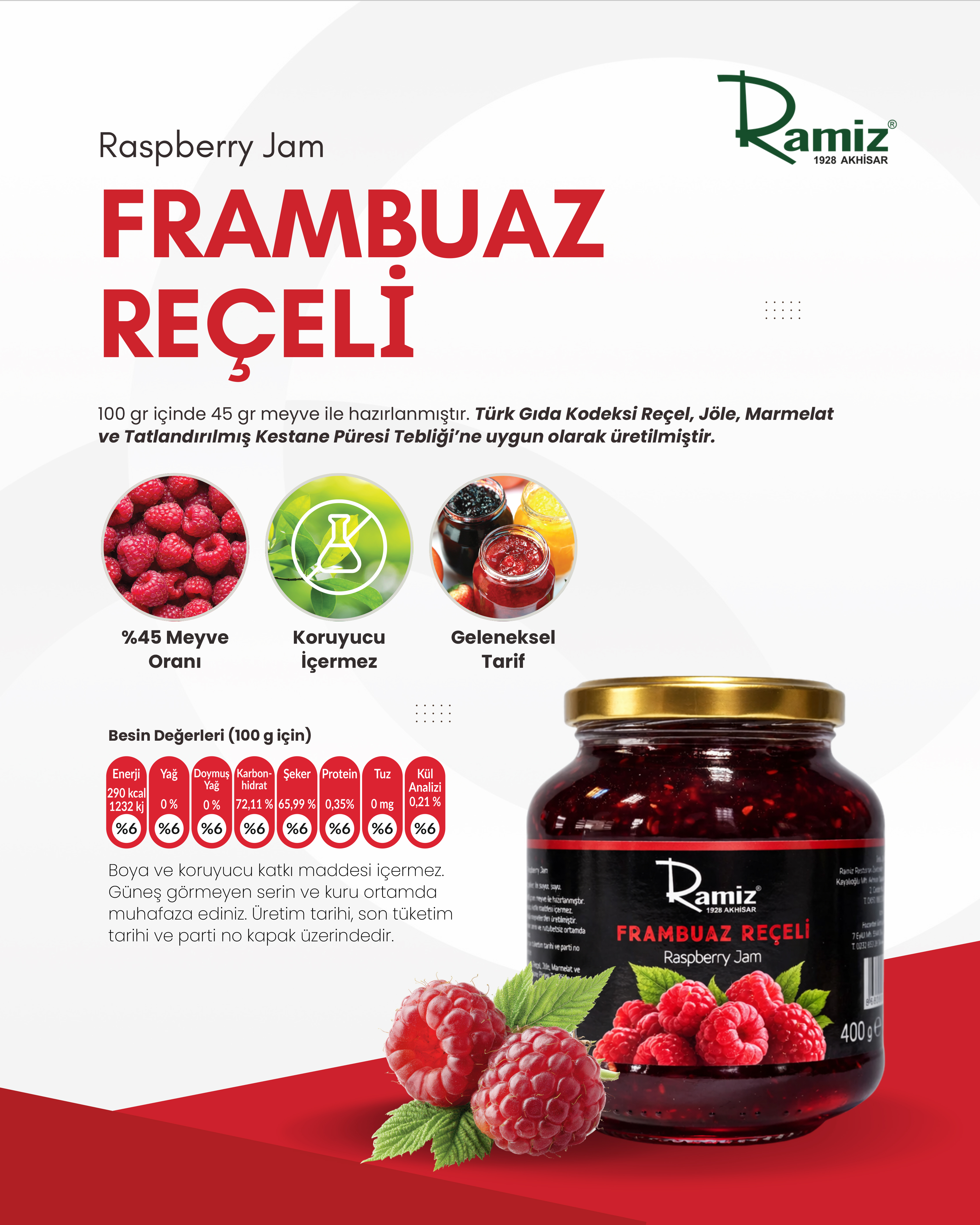 Doğal Katkısız Frambuaz Reçeli 380 gr. ; İçindekiler:Frambuaz,şeker,limon suyu. Türk Gıda Kodeks Reçel,Jöle,Marmelat ve Tatlandırılmış Kestane Püresi Tebliği'ne uygun olarak üretilmiştir.  Ramiz ürünleri 1928'den beri lezzet markasıdır. Üretim tesislerimiz TC.TARIM VE ORMAN BAKANLIĞI onaylıdır.