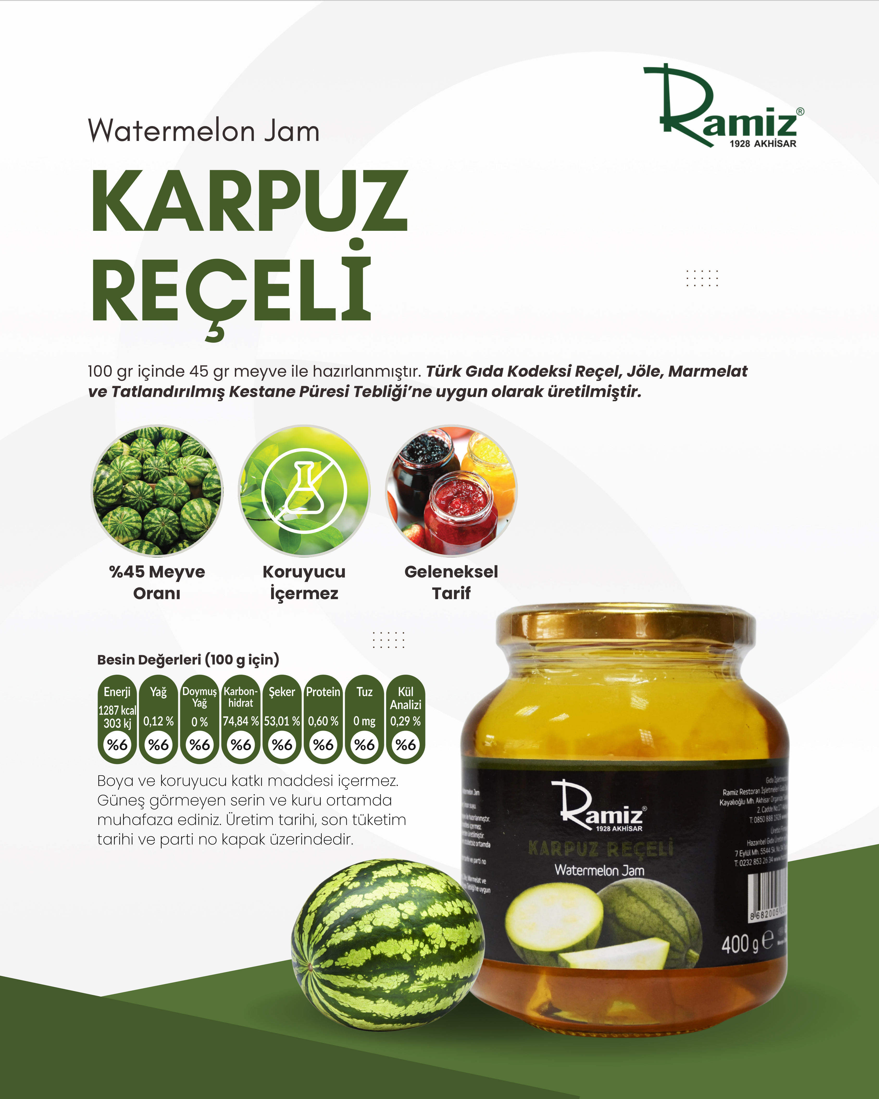 Doğal Katkısız Karpuz Reçeli 380 gr.  İçindekiler:Karpuz,şeker,limon suyu. Türk Gıda Kodeks Reçel,Jöle,Marmelat ve Tatlandırılmış Kestane Püresi Tebliği'ne uygun olarak üretilmiştir.  Ramiz ürünleri 1928'den beri lezzet markasıdır.  Üretim tesislerimiz TC.TARIM VE ORMAN BAKANLIĞI onaylıdır.