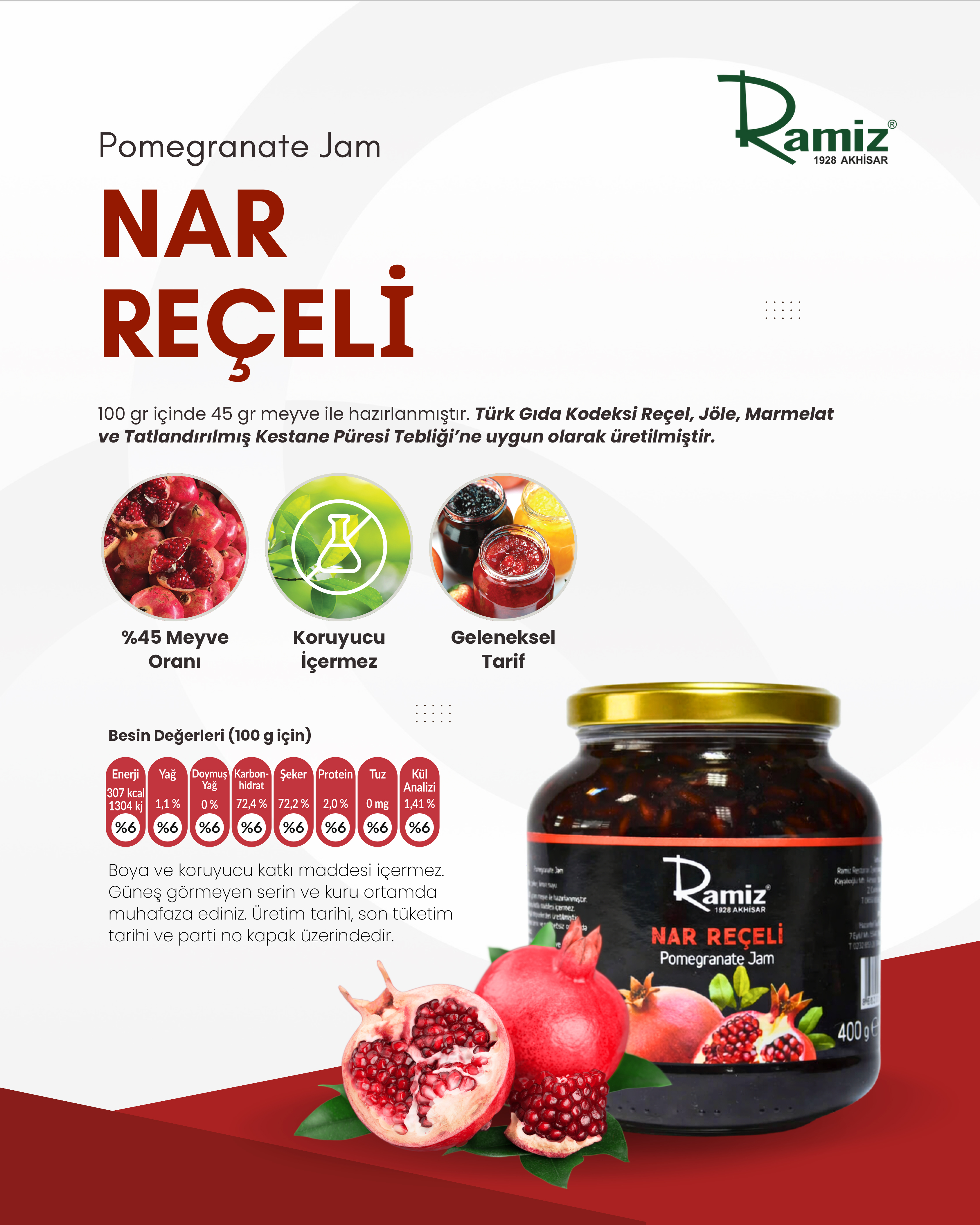 Doğal Katkısız Nar Reçeli 380 gr.  İçindekiler:Nar,şeker,limon suyu. Türk Gıda Kodeks Reçel,Jöle,Marmelat ve Tatlandırılmış Kestane Püresi Tebliği'ne uygun olarak üretilmiştir.  Ramiz ürünleri 1928'den beri lezzet markasıdır.  Üretim tesislerimiz TC.TARIM VE ORMAN BAKANLIĞI onaylıdır.