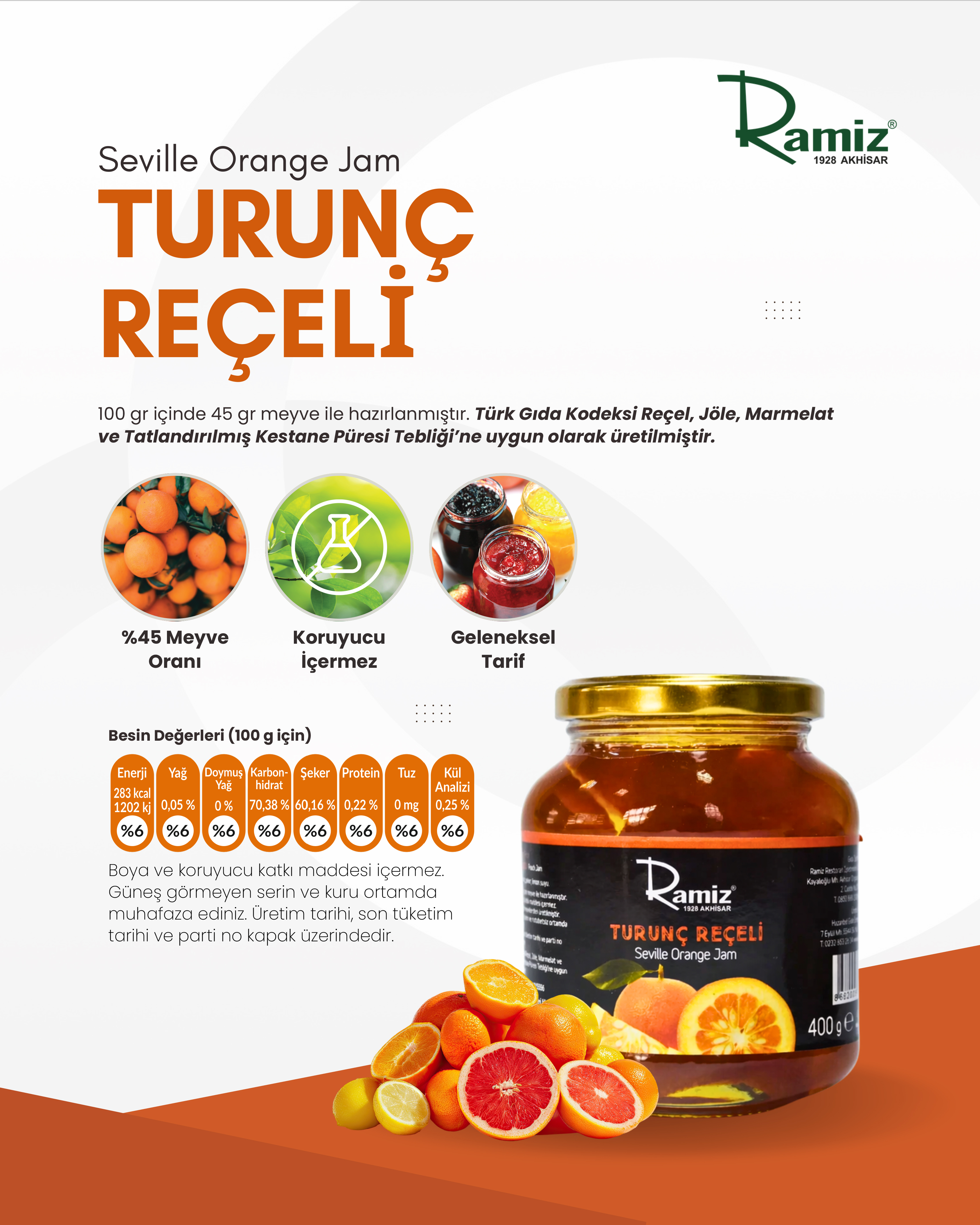 Doğal Katkısız Turunç Reçeli 380 gr.  İçindekiler:Turunç,şeker,limon suyu. Türk Gıda Kodeks Reçel,Jöle,Marmelat ve Tatlandırılmış Kestane Püresi Tebliği'ne uygun olarak üretilmiştir. Ramiz ürünleri 1928'den beri lezzet markasıdır. Üretim tesislerimiz TC.TARIM VE ORMAN BAKANLIĞI onaylıdır.