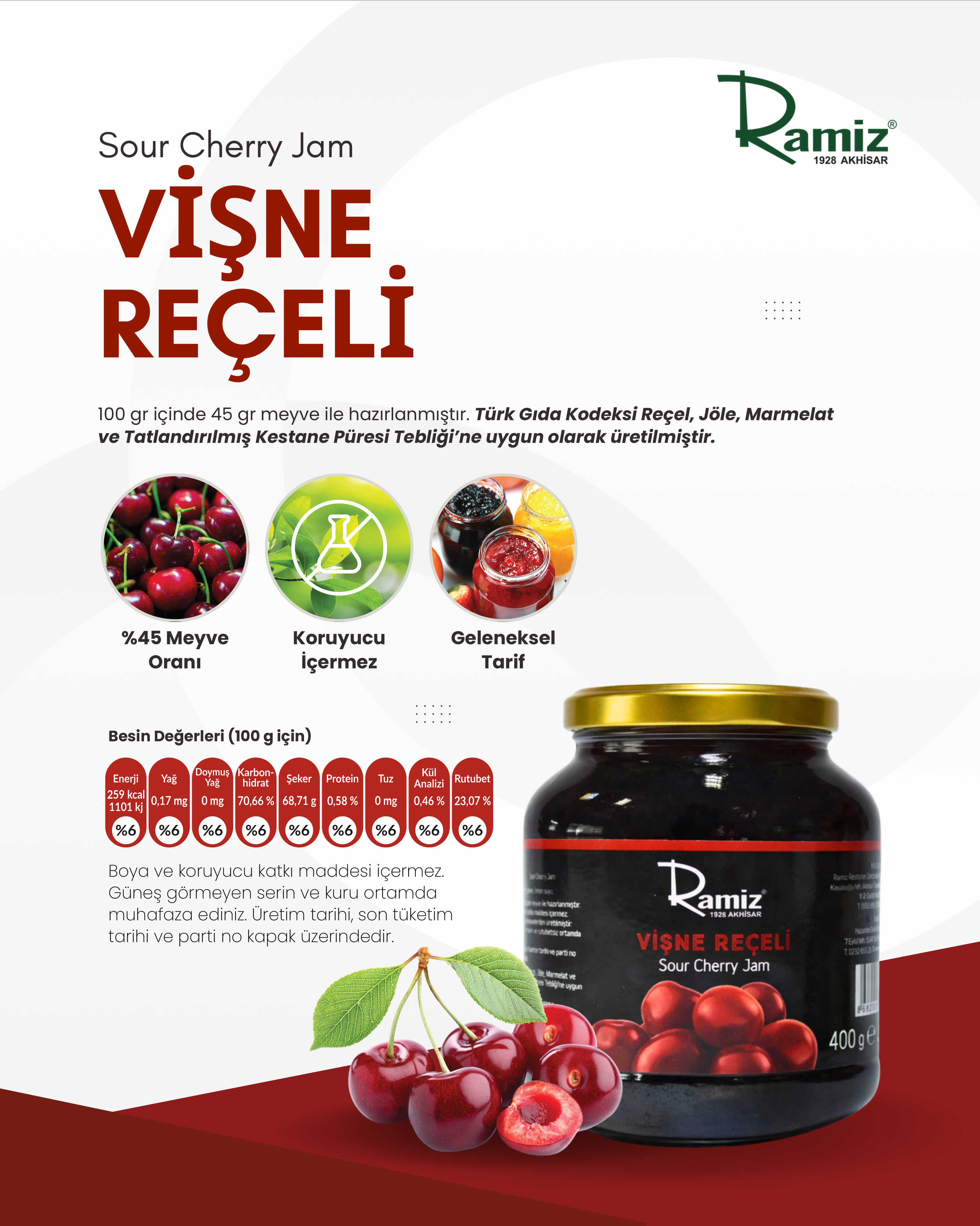 Doğal Katkısız Vişne Reçeli 380 gr. ; İçindekiler:Vişne,şeker,limon suyu. Türk Gıda Kodeks Reçel,Jöle,Marmelat ve Tatlandırılmış Kestane Püresi Tebliği'ne uygun olarak üretilmiştir.Ramiz ürünleri 1928'den beri lezzet markasıdır. Üretim tesislerimiz TC.TARIM VE ORMAN BAKANLIĞI onaylıdır.;