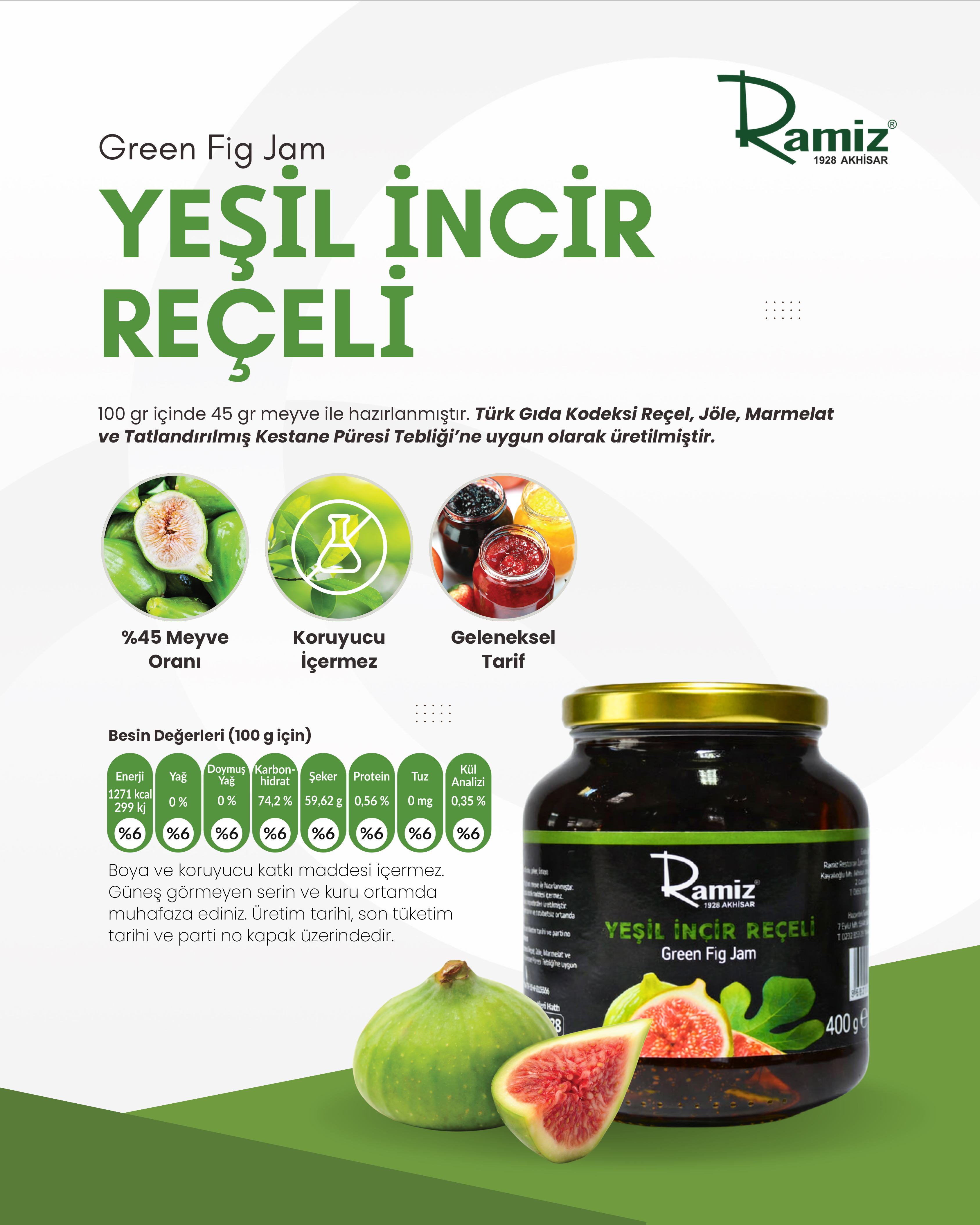 Doğal Katkısız Yeşil İncir Reçeli 380 gr.  İçindekiler:Yeşil incir,şeker,limon suyu. Türk Gıda Kodeks Reçel,Jöle,Marmelat ve Tatlandırılmış Kestane Püresi Tebliği'ne uygun olarak üretilmiştir.  Ramiz ürünleri 1928'den beri lezzet markasıdır.  Üretim tesislerimiz TC.TARIM VE ORMAN BAKANLIĞI onaylıdır.