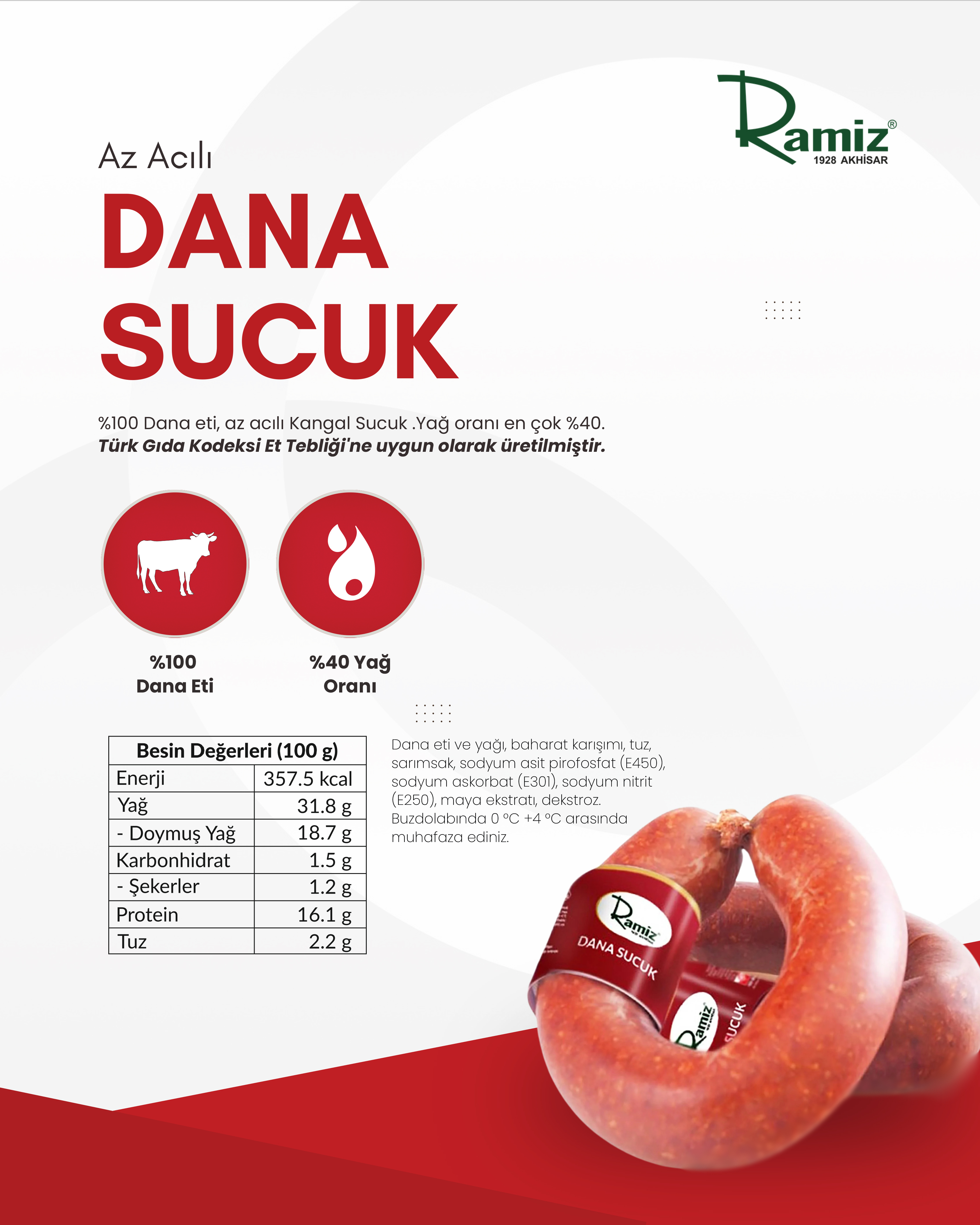 Yağ oranı en çok %40. Ramiz ürünleri, 1928'den beri lezzet markasıdır. Türk Gıda Kodeksi Et Tebliği'ne uygun olarak üretilmiştir. Üretim tesislerimiz, T.C. Tarım ve Orman Bakanlığı onaylıdır. Ramiz Kangal Sucuk, geleneksel lezzetiyle sizlerle!