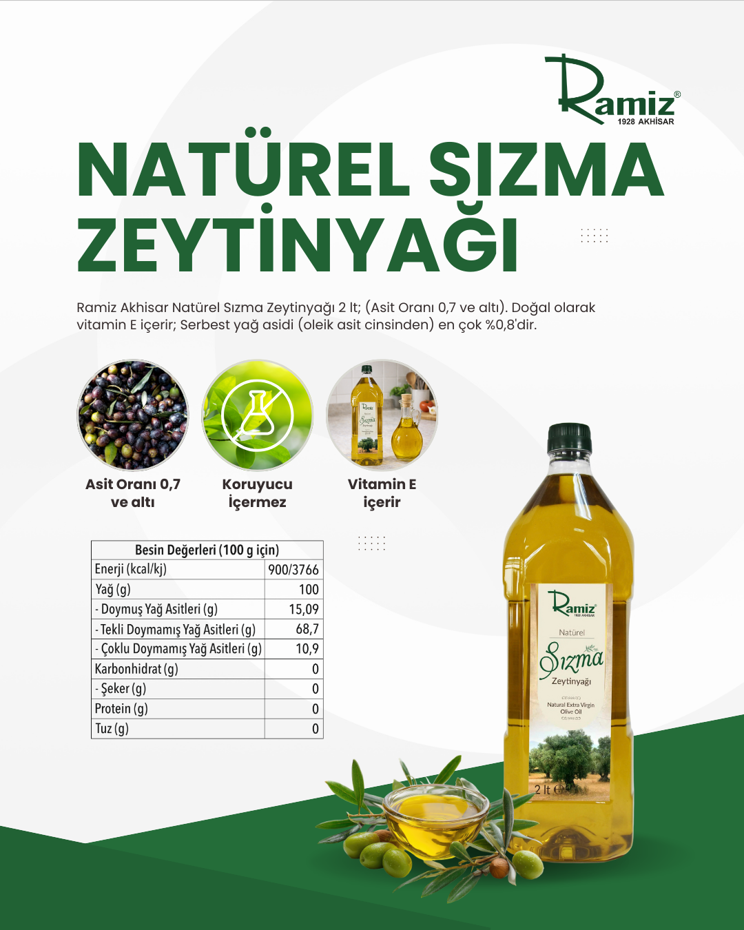 Ramiz Akhisar Natürel Sızma Zeytinyağı 2 lt; (Asit Oranı 0,7 ve altı) İçindekiler: Natürel Sızma Zeytinyağı Zeytinyağı soğukta muhafaza edildiğinde donar; Kuru, serin ve kokusuz ortamda, ışıktan koruyarak saklanmalıdır; Plastik kapağı açarak kullanınız; Kullanımdan sonra kapağı kapatınız; Doğal olarak vitamin E içerir; içermez; Serbest yağ asidi (oleik asit cinsinden) en çok %0,8'dir; Ramiz ürünleri 1928'den beri lezzet markasıdır; Üretim tesislerimiz T; C TARIM VE ORMAN BAKANLIĞI onaylıdır; ;;