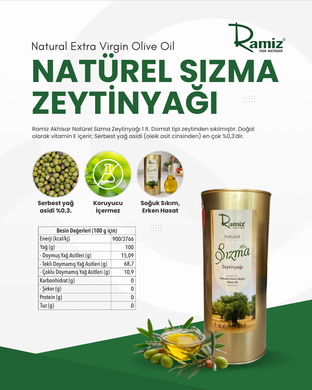 Domat Natürel Sızma Zeytinyağı soğukta muhafaza edildiğinde donar. Kuru, serin ve kokusuz ortamda, ışıktan koruyarak saklanmalıdır. Doğal olarak vitamin E içerir. Serbest yağ asidi (oleik asit cinsinden) en çok %0,3'dür. Ramiz ürünleri 1928'den beri lezzet markasıdır. Üretim tesislerimiz T.C TARIM VE ORMAN BAKANLIĞI onaylıdır.